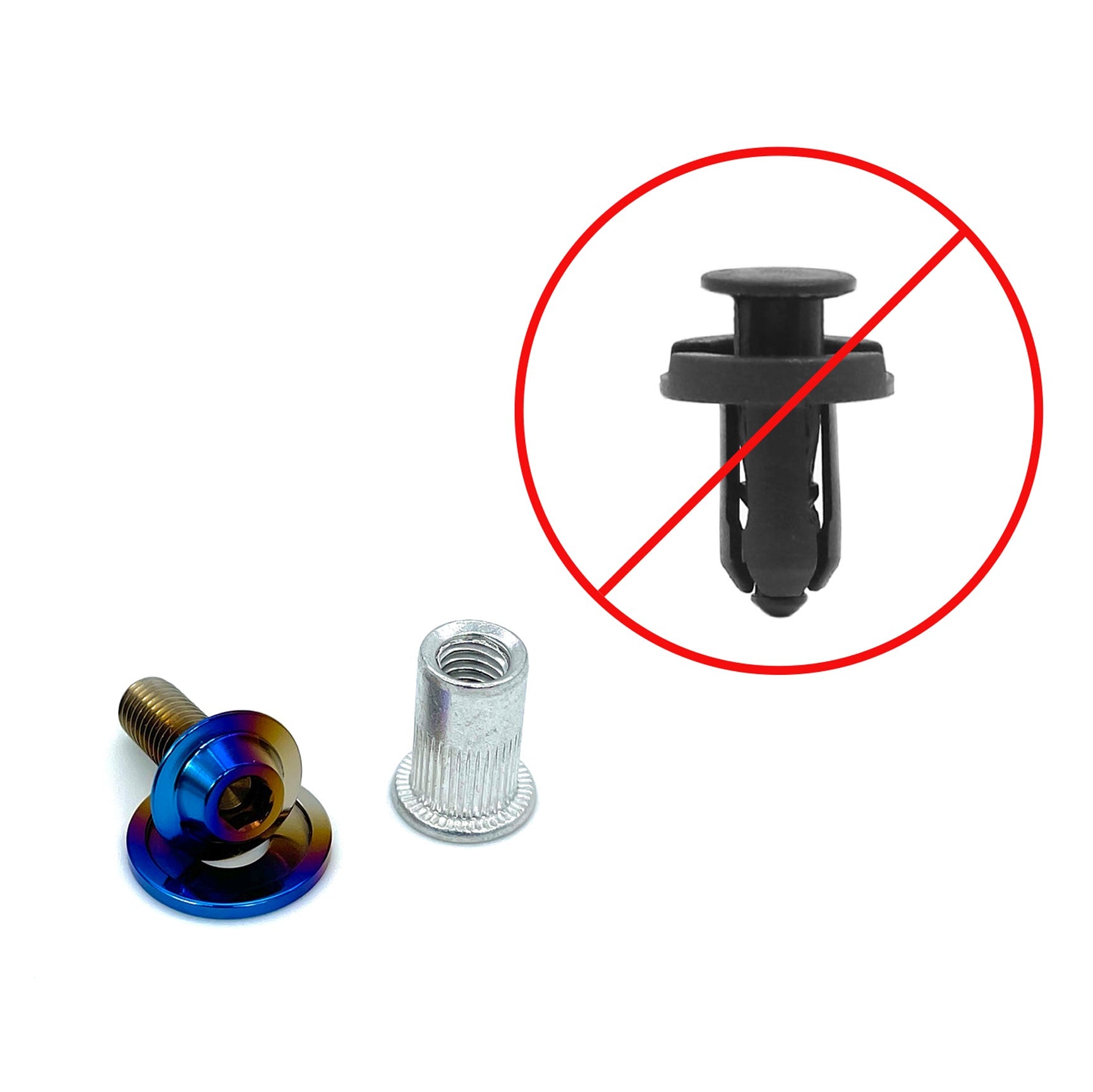 - Each plastic rivet is replaced with an aluminum rivet nut or rubber well nut that adds threads to the hole for your bolt. Once you have the rivet nut installed (rivnut tool sold separately), you can simply screw the titanium bolt and washer in place. It's that simple! This kit can be used anywhere where a plastic rivet was once used. We have multiple bolt lengths and washer sizes to work on any application!