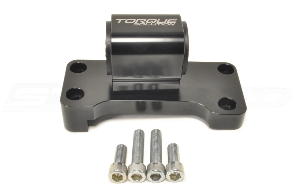 Torque Solution transmission mount for 5-speed Evo 7/8/9. Made of high grade billet aluminum material, urethane bushings and steel pins. This is a direct replacement of the OEM mount. This mount is for 5-speed only, does not fit 6-speed, but can be used if you swap a 5-speed transmission in an MR. Includes the mount and 4 bolts.